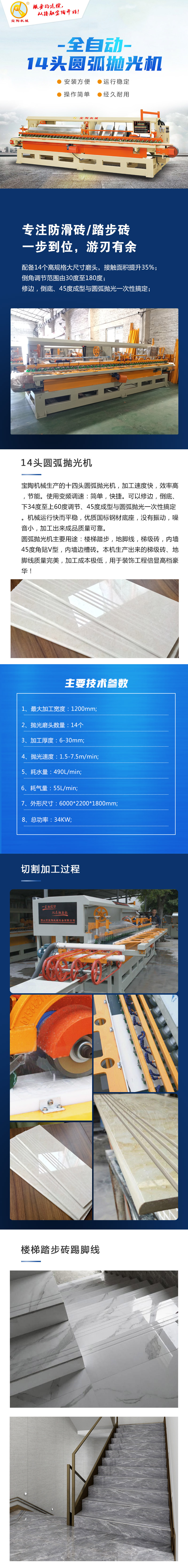 BT-1200型十四頭多功能圓弧拋光機,加工速度更快,效率更高,更節(jié)能。使用變頻調速:簡單,快捷。可以修邊,倒底、下34度至上60度調節(jié)、45度成型與圓弧拋光一次性搞定。機械運行快而平穩(wěn),優(yōu)質國標鋼材底座,沒有振動,噪音小,加工出來成品質量可靠。14個大磨頭高速拋光,加工成本低,保養(yǎng)維護方便。