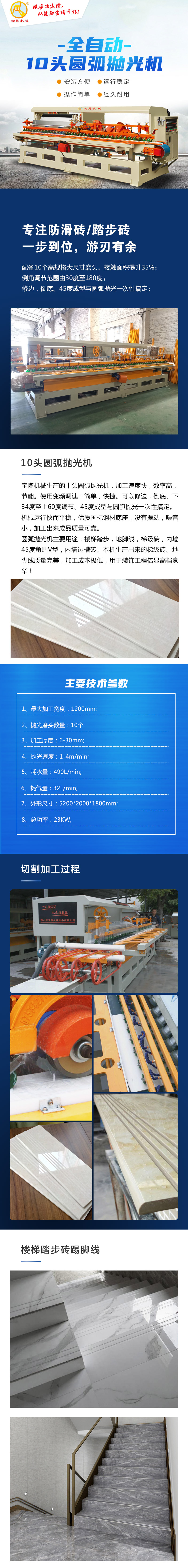 BT-1200型十頭圓弧拋光機(jī),加工速度更快,效率更高,更節(jié)能。使用變頻調(diào)速:簡單,快捷。可以修邊,倒底、下34度至上60度調(diào)節(jié)、45度成型與圓弧拋光一次性搞定。機(jī)械運(yùn)行快而平穩(wěn),優(yōu)質(zhì)國標(biāo)鋼材底座,沒有振動(dòng),噪音小,加工出來成品質(zhì)量可靠。14個(gè)大磨頭高速拋光,加工成本低,保養(yǎng)維護(hù)方便。